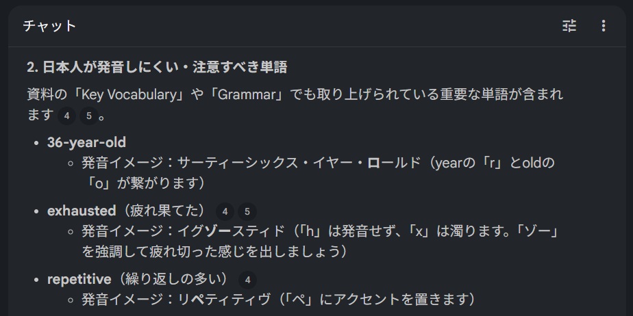 NotebookLMに「この文章を音読するための、意味のかたまり(チャンク)ごとの区切りと、発音の注意点を教えて」と指示すれば、まるで発音コーチのように台本を作り上げてくれます。