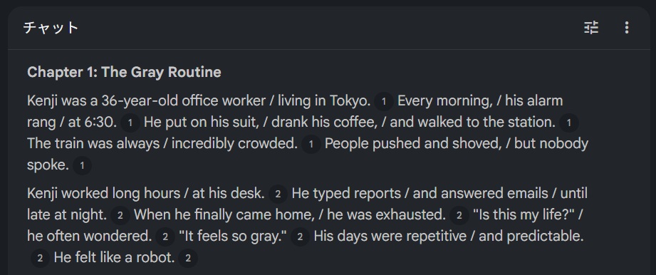 NotebookLMに「この文章を音読するための、意味のかたまり(チャンク)ごとの区切りと、発音の注意点を教えて」と指示すれば、まるで発音コーチのように台本を作り上げてくれます。