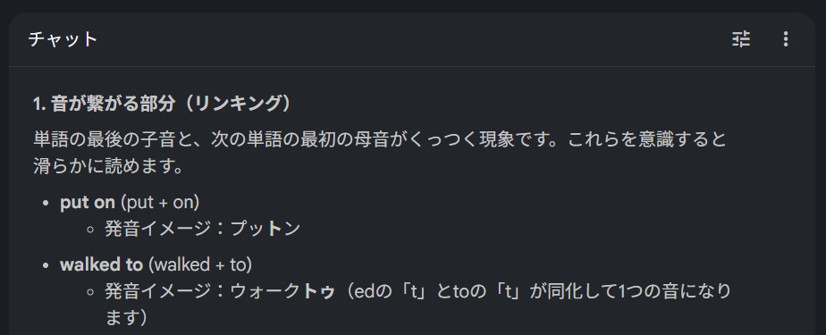 ※特典のショートストーリーには発音やリンキング関する内容は入れていないので、NotebookLMが一般的な英語学習知識に基づいて説明してくれています。参考画像を繋げていますので、どのようにNotebookLMが出力してくれるか参考にしてみてください。